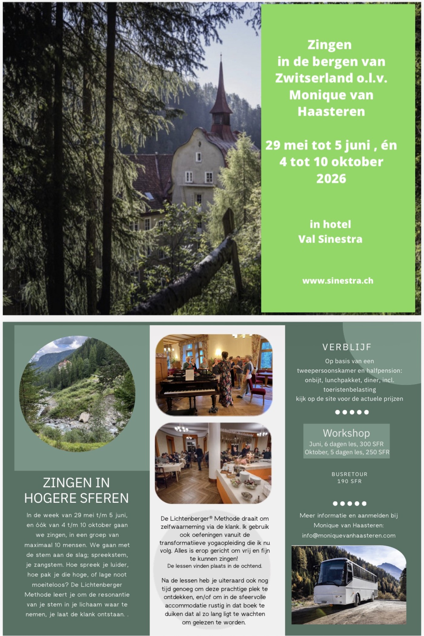 Sinds drie jaar geef ik zangles in Val Sinestra. Vijf dagen, een lange ochtend, in een leuke groep, aan je stem, meerstemmigheid, werken, en 's middags heb je ruim de tijd om Val Sinestra en omstreken te ontdekken.